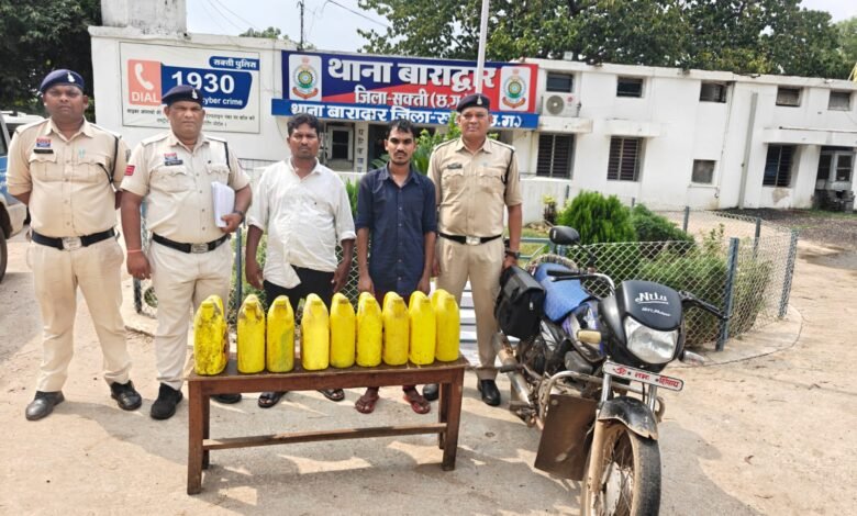 पुलिस अधीक्षक सुश्री अंकिता शर्मा के निर्देशानुसार, जिले में अवैध शराब, जुआ एवं मादक पदार्थों के खिलाफ चलाए जा रहे विशेष अभियान के तहत थाना बाराद्वार पुलिस को बड़ी सफलता हाथ लगी है। दिनांक 29.05.2025 को थाना प्रभारी निरीक्षक लखन पटेल के नेतृत्व में की गई ताबड़तोड़ कार्रवाई में दो आरोपियों को गिरफ़्तार कर उनके कब्जे से 45 लीटर कच्ची महुआ शराब तथा एक मोटरसाइकिल जब्त की गई।