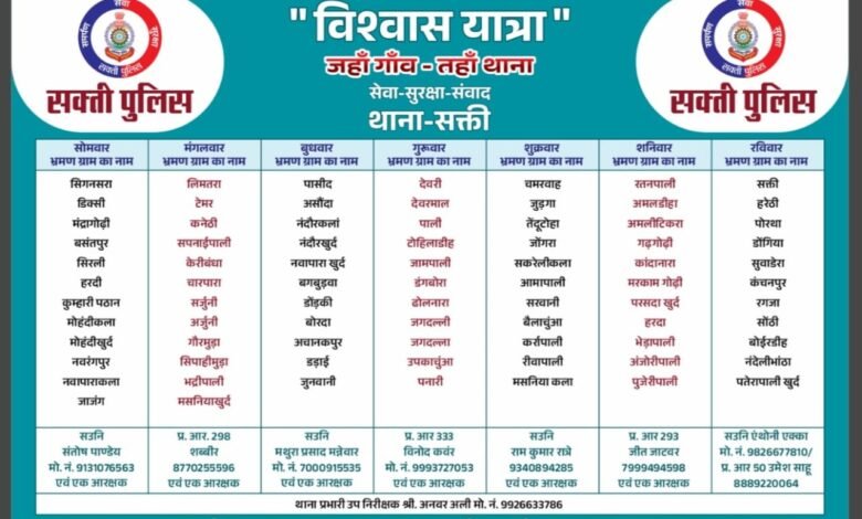 “विश्वास यात्रा – जहाँ गाँव, तहाँ थाना” नामक विशेष जनसंपर्क अभियान के रूप में सक्ती पुलिस ने एक ऐतिहासिक पहल की शुरुआत की है, जो न सिर्फ़ प्रशासनिक दृष्टि से सराहनीय है, बल्कि ग्रामीण जनजीवन में पुलिस की सकारात्मक उपस्थिति को भी गहराई से स्थापित करने की दिशा में एक बड़ा कदम है।