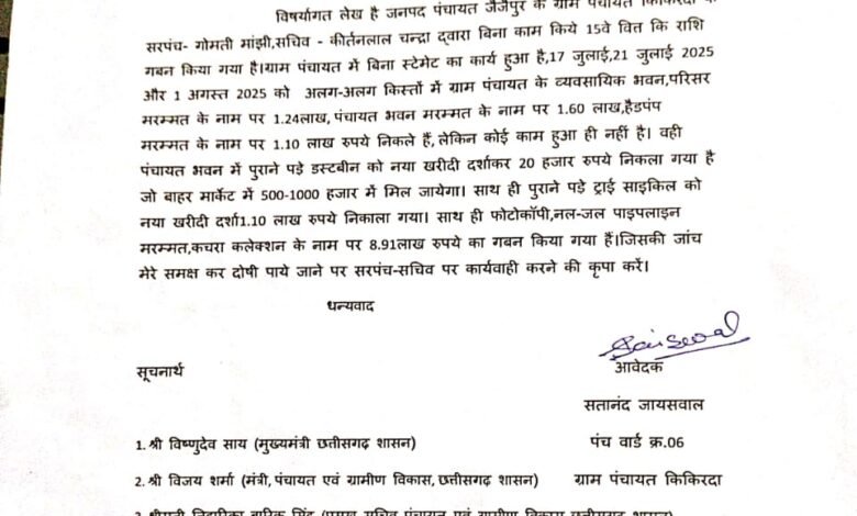 ब्लॉक के ग्राम पंचायत किकिरदा में सरपंच और सचिव की कथित मिलीभगत से 15वें वित्त आयोग की राशि के गबन का गंभीर आरोप सामने आया है। ग्रामीणों ने कलेक्टर, जिला पंचायत सीईओ और जनपद सीईओ से लिखित शिकायत कर मामले की उच्चस्तरीय जांच की मांग की है।